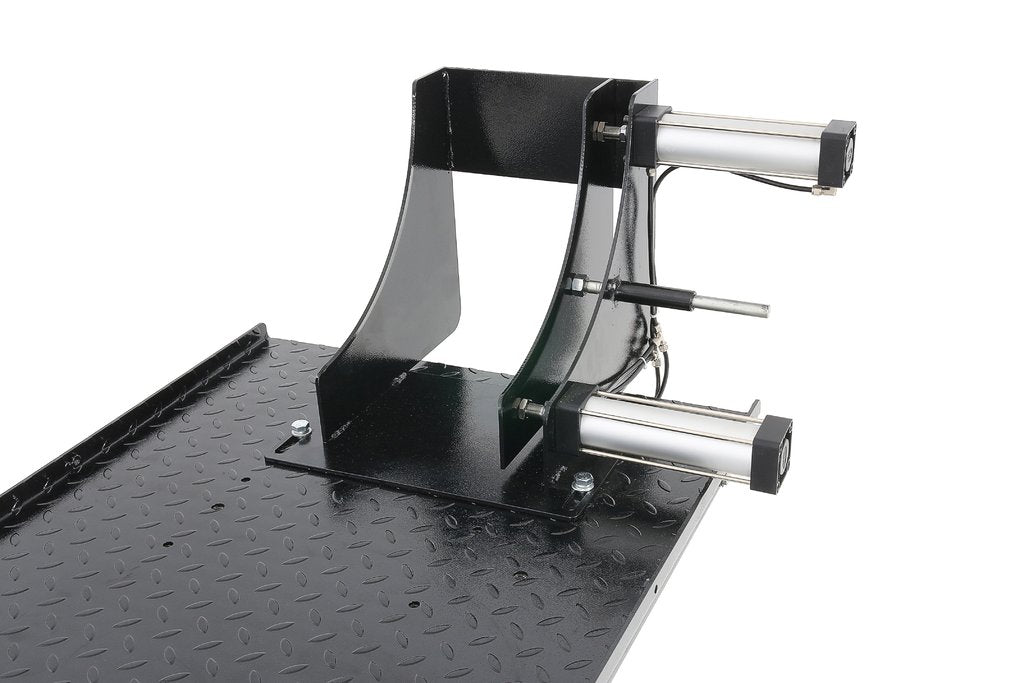 Die sehr hochwertige Radklemme wird über zwei doppeltwirkende Pneumatikzylinder geklemmt. Die Bedienung ÖFFNEN/SCHLIEßEN erfolgt über einen Fußschalter/Wippe. Dieser Fußschalter befindet sich unten an der Längsseite der Bühne . Die Öffnungsweite der Radklemme beträgt 215mm