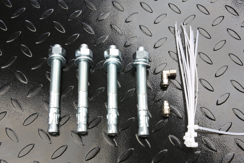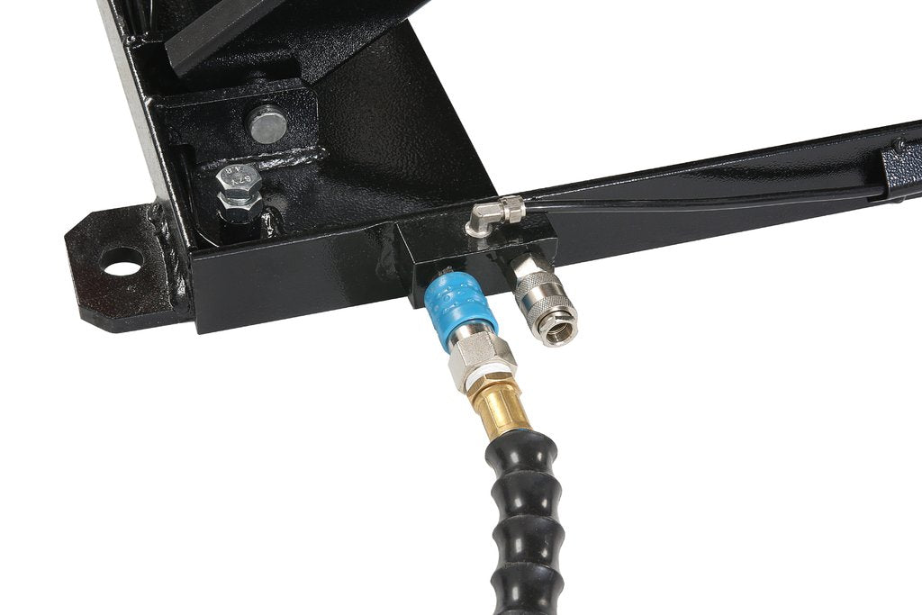 Das Anschlussterminal für die Druckluftversorgung befindet sich am unteren Bühnenrahmen. Direkt neben dem Drucklufteingang, an welchem man seinen Kompressor anschließen kann, befindet sich auch wieder eine Schnellkupplung für einen Druckluftausgang. So kann man z.B. diverse Druckluftwerkzeuge direkt an der Bühne mit Druckluft versorgen.